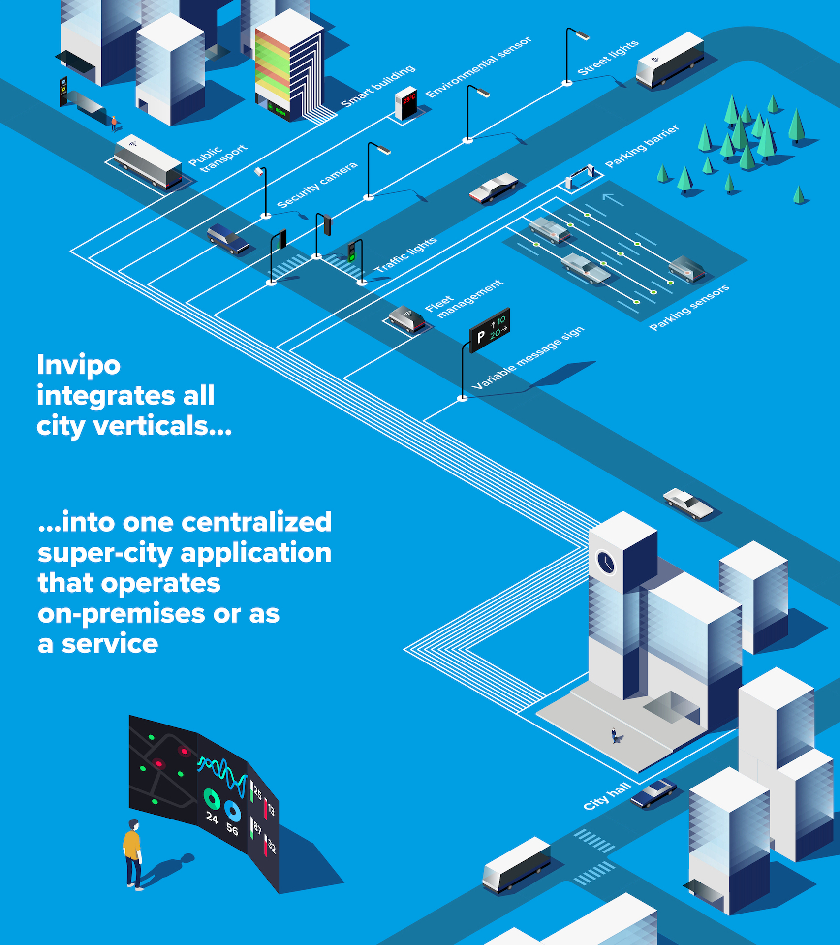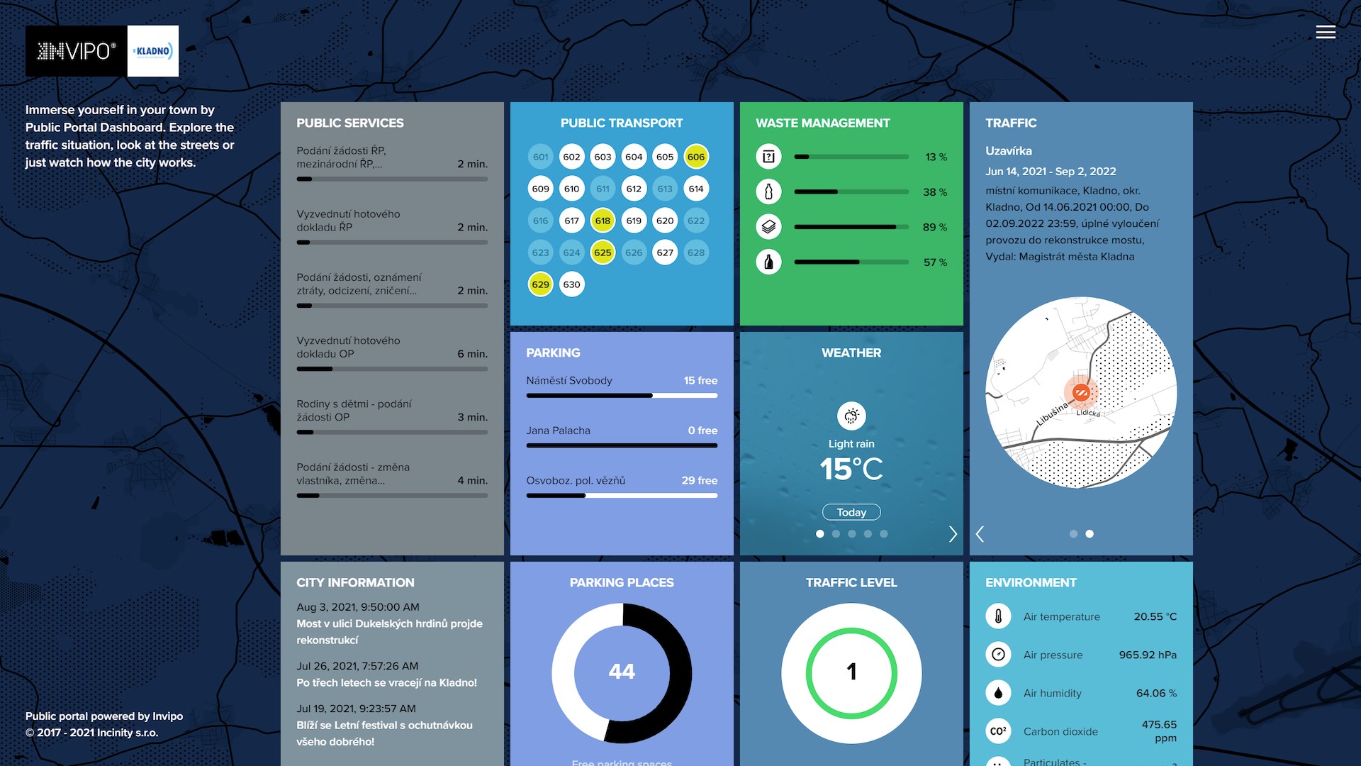 The Invipo integration platform is a clear-cut and user-friendly application designed to centralize cities’ data. Using integrated information, an umbrella application enables the effective management of urban technologies, the identification of eventual problems, and their quick and intuitive resolution, as well as delivering useful and up-to-date information at any time to end users through a set of modern information channels. The platform Invipo unifies data forwarded by a range of so-called vertical technologies (traffic lights, traffic counters, air quality sensors, streetlights, bike sharing, public transport, energy consumption, etc.), stores it in one robust database and then transforms it into actionable information.